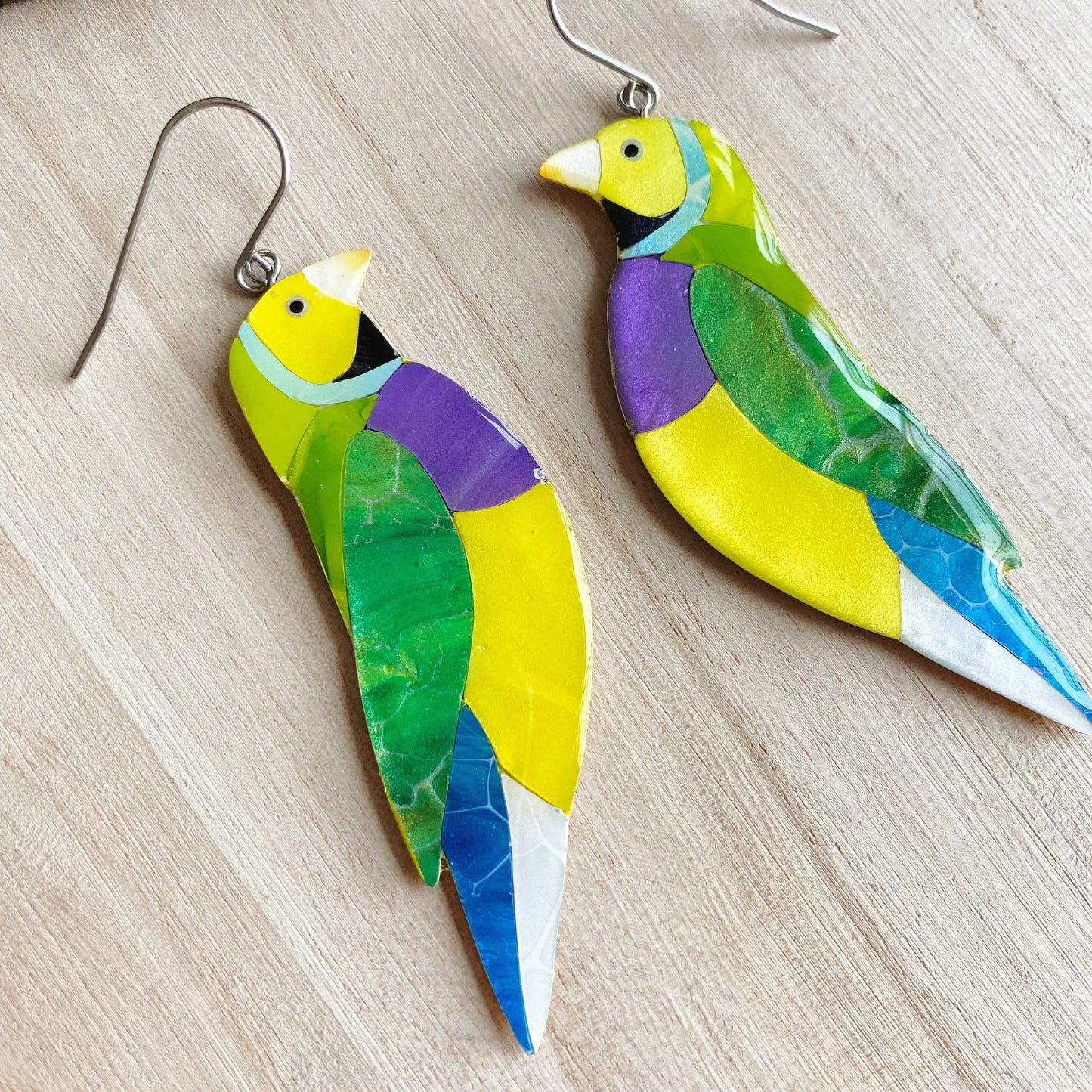 These colourful Gouldian Finch earrings are created from cut pieces of fluid artwork - with every piece carefully put together by hand - each pair has it's own unique pattern & makes them one of a kind.