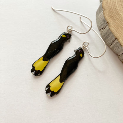 Part of a collection inspired by native Australian birds, these mini-sized Yellow-tailed Black Cockatoo earrings are wearable art for your ears!